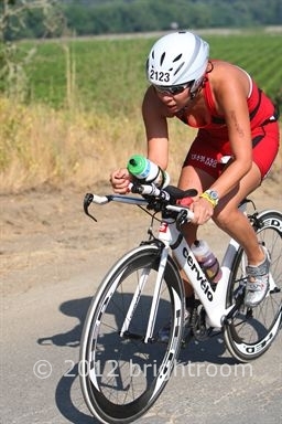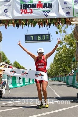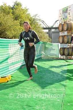 Run: I had looked forward to the run for most of the bike leg. I started the run with a small cramp due to shallow breathing. So I kept repeating, “relax” “legs” “relax” “legs”. “Relaxed” reminded me to deepen my breathing and “legs” helped me refocus on energy to my legs and to release the tension in my upper body. It worked and I was off. I felt like I was peeling off the time that I felt I might have lost on the bike. For the most part I felt as if I was on pace for low 7:30 min/mi but the course was not marked clearly (actually there were NO mile markers on the bike) so I was using the aid stations as my markers. Bad idea. I don’t typically race with my Garmin 210 but after this experience I probably will. The first 6 miles went by fast because I really did not know what mile was at until I hit the winery. I kept repeating “God peace. God strength.” “Swift legs. Just look ahead and down.” “Focus. Focus.” This helped me not focus so much on the hills and descends and kept my heart rate steady. By the time I hit the winery I asked this dude with a Garmin what mile we were at and what pace he was holding. He told me 7th mile and 8:15’s but by that time there was a sign that said “Mile 7” (the first mile marker that I clearly saw since the start of the race!) he proceeded to chat with me in a conversational manner for the next 1.5 miles. asking where I was from, had I done the race before, sharing his experiences in the area. I noticed I was getting frustrated because I knew I could go faster but if not for the chatting away. I struggled with being polite and sports (wo)man like or just running away like some rude chic (glad I did not because we saw him at bike pick up and he was very gracious). By this time we hit an aid station and he said he was going to walk, “thank God “ I thought and took off at my pace. I saw him at a turnaround he was going in and I was going out. Gave a high five and kept trucking. Those last 4 miles were tough because there were some turns that looked exactly alike. I was thinking I was in the Twilight Zone. I kept redirecting my thoughts to my legs, reassuring them that they knew what to do. At each aid station I took in water, coke, and intermittently Gatorade. I finally hit the last stretch in which it was a straight away for about 1.5 miles. I saw a Chico Tri Club kit and recognized Jennifer Moore! I was so happy and inspired to see her. She looked strong and steady. We exchanged encouragements and she said “I can’t believe you did 10 of these!” I said or thought, “it nevers gets any easier!” I passed her and then finally hit the finish!