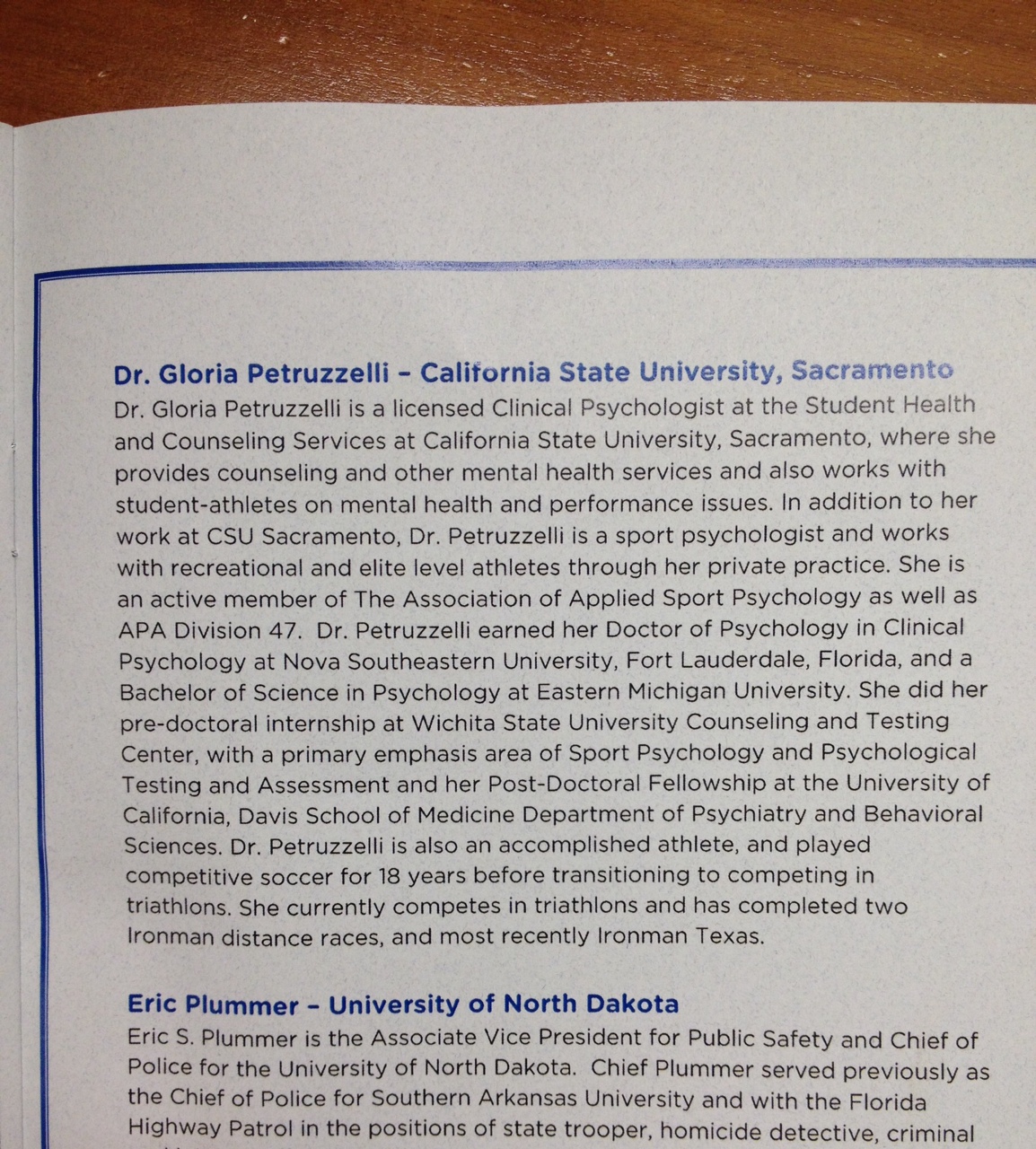 Last week I had the pleasure of presenting at the First Annual Big Sky Conference Student-Athlete Wellness Symposium at University of North Dakota on behalf of Sac State Student Health and Counseling Services. There was a well rounded group of us that went and presented. My presentation topic was focused on developing “The Mindful Athlete.” It is an area of expertise that I am very passionate about, not just for athletes, but everyone. During my talk I had the opportunity to speak to Big Sky Conference university presidents (including Sacramento State’s president Gonzalez), athletic department administrators, sports medicine providers, mental health providers, and associated staff on the importance of developing a more mindful student athlete. How amazing is that?! I got excellent feedback and most importantly I got people thinking differently about mindfulness and meditation. After the presentation I had some spontaneously wonderful conversations about incorporating mindfulness in our daily lives and many people were surprised to hear that it is a simple practice. Trust me practicing mindfulness or meditation does not mean sitting in Lotus pose for hours on end. Nope just minutes a day for 8 weeks has proven benefits. The audience was also surprised to know that these organizations, people, and athletes regularly practice mindfulness and/or meditation