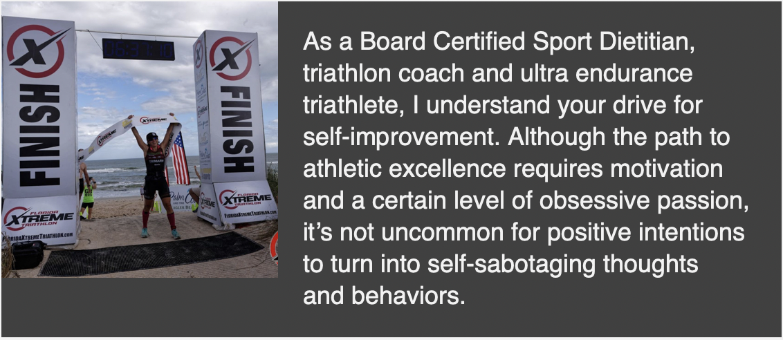 It’s not uncommon for driven athletes to become hyper-focused or obsessed with food and with the idea of controlling eating to reach a performance, health or body composition goal. Inflexible thinking increases the tendency of making decisions with an all or nothing, black or white mentality. As a result, any deviation from self-imposed rules becomes an unacceptable failure. As a result, this adds fuel to the fire and perpetuates a stronger drive toward perfection and control. It can be difficult for the highly driven athlete to accept suggestions or advice from well-meaning professionals – keeping you in a cycle of self-sabotage.