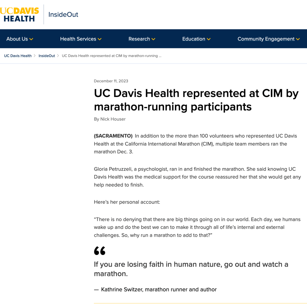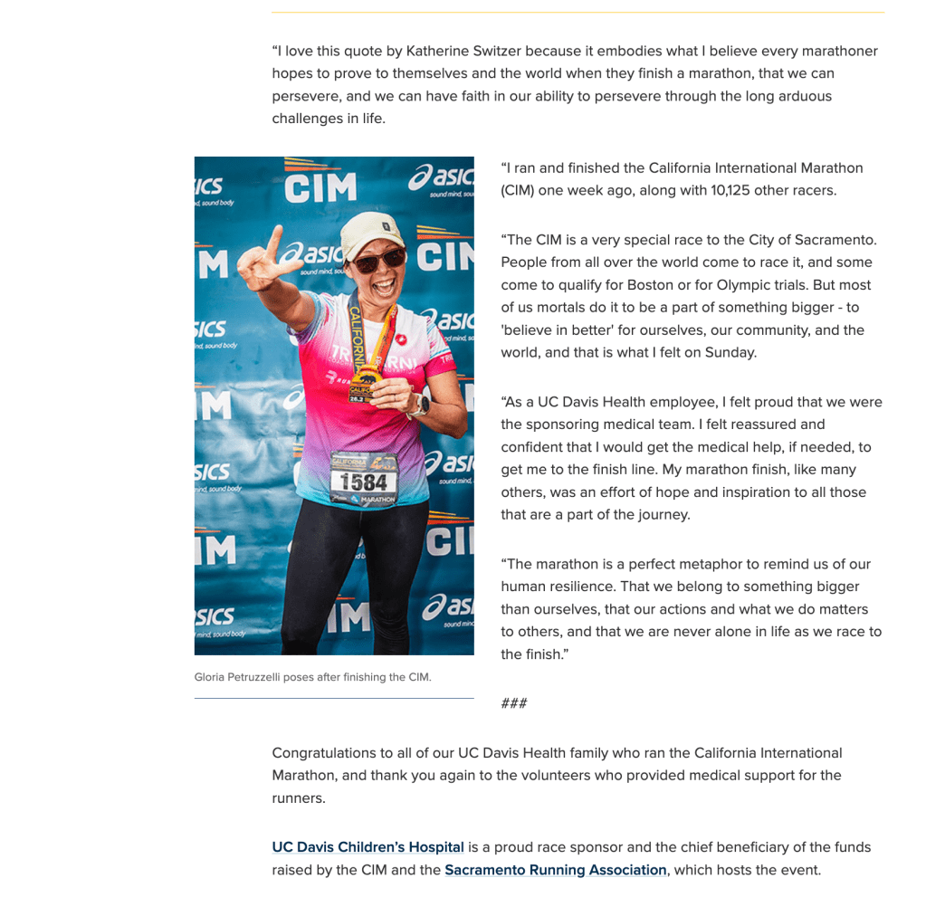 Hi Everyone, Two weeks ago had my 2nd CIM finish! And while it was my longest marathon yet- I’ve had two other marathons, but those were tagged after a 2.4 mile swim and 112 mile bike 😉 However, running this race meant something different and more than just chasing a finishing time or place…it was about the experience, the process, and the community. Check out my employee feature is the official UCD Health webpage link: https://health.ucdavis.edu/insideout/news/headlines/uc-davis-health-represented-at-cim-by-marathon-running-participants/2023/12